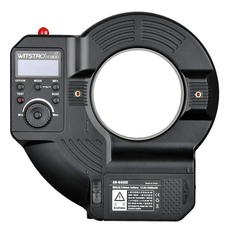 The Witstro AR400 has a flash power of 400Ws and is adjustable in brightness in 22 steps. The ring flash provides support for S1 / S2 slave triggering, RPT stroboscopic flash, high-speed sync and much more. The AR400 is powered by a professional lithium battery with a capacity of 4500mAh, good for approximately 450 flashes at full power. The recycle time of 0.05-2.8 seconds is super fast. A battery charger is included to charge the battery.
