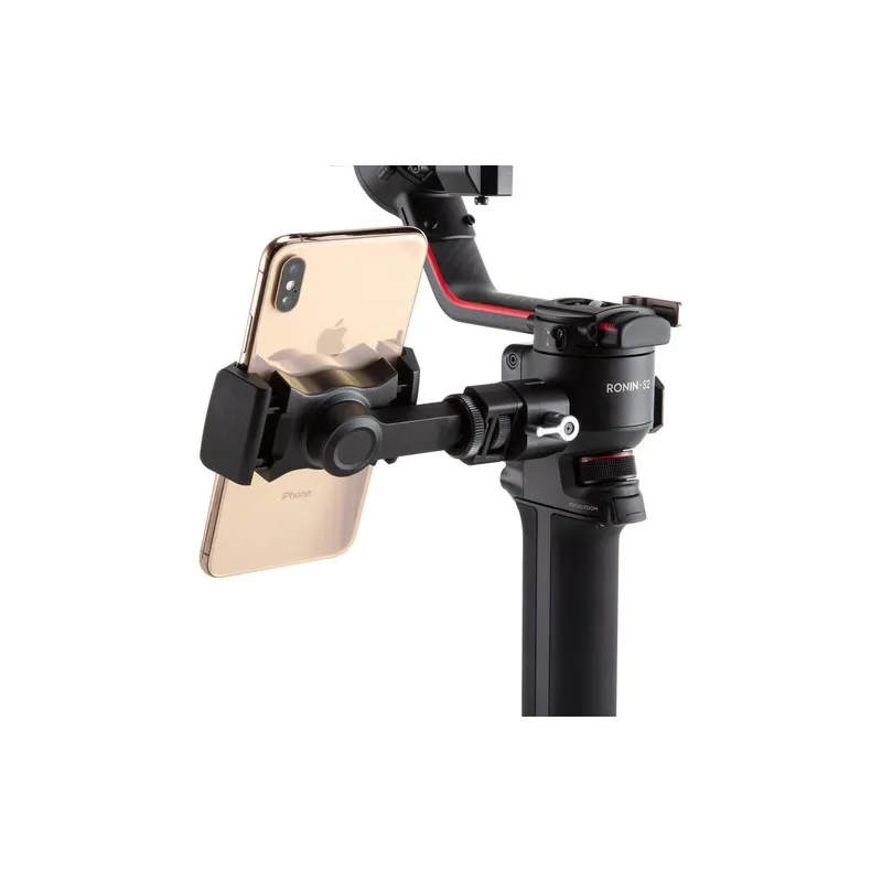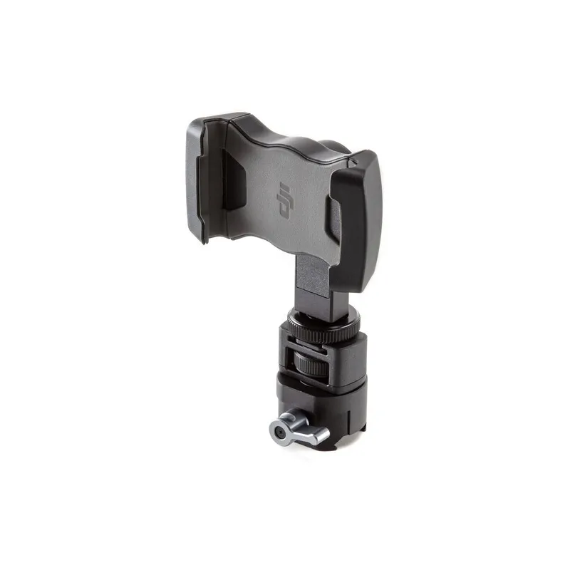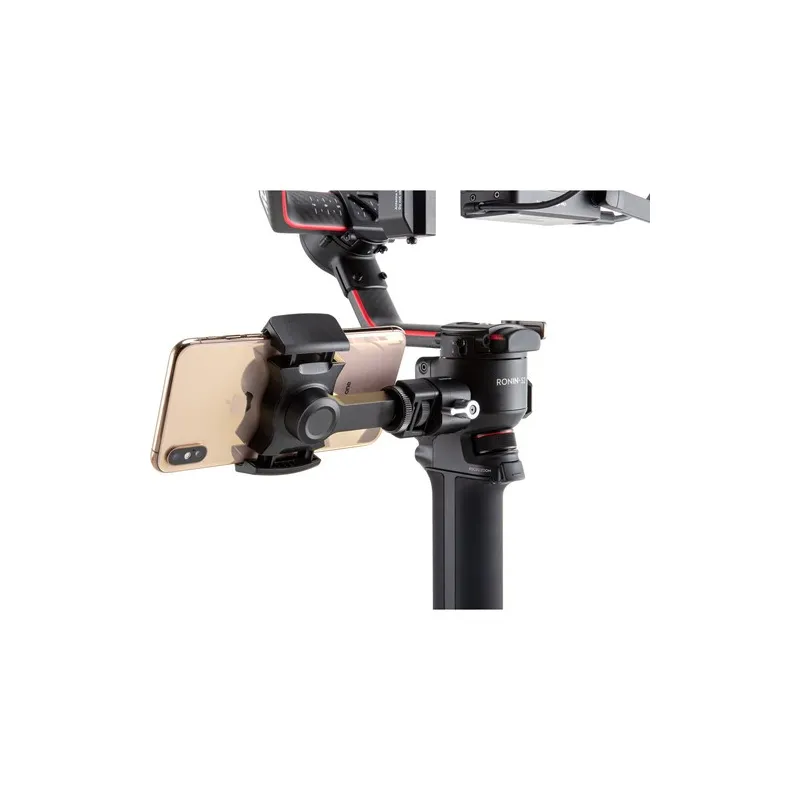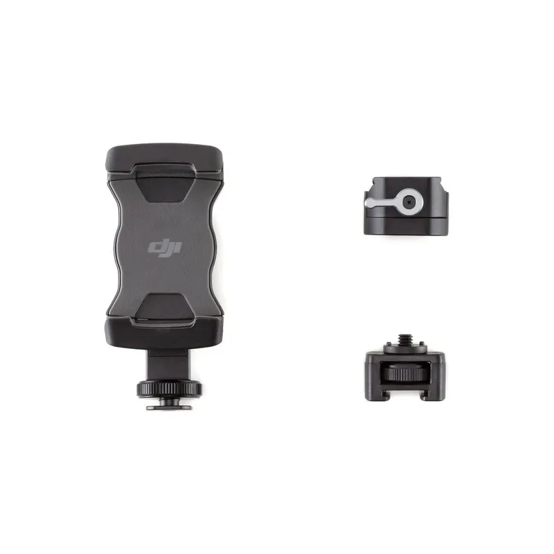 The DJI R Phone Holder attaches to the RS 2 and RSC 2 gimbals to hold a smartphone for monitoring and for the ActiveTrack 3.0 and Force Mobile features of the gimbals. Using included NATO/cold shoe mounting components, it can be attached to the NATO mount on the side of the gimbal. With these accessories removed, it offers a 1/4"-20 thread for attachment to a support such as a tripod to be used off the gimbal. For optimal positioning, the R Phone Holder can be rotated to hold your phone horizontally or vertically. All standard smartphones are supported via the adjustable grip jaws.