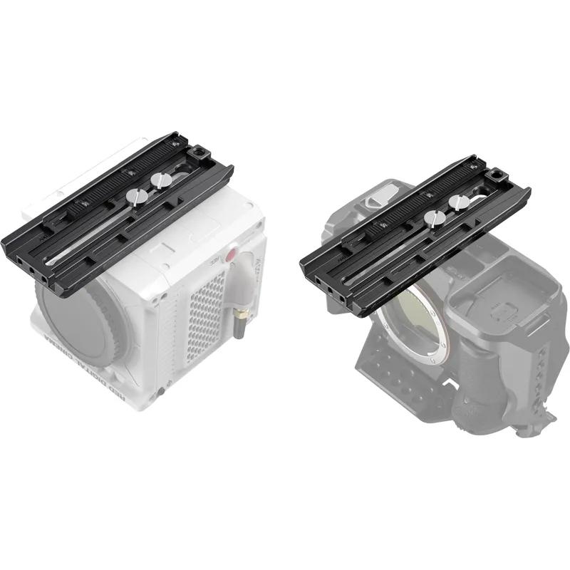 3158 is designed for assisting the camera to switch quickly between Manfrotto tripod, shoulder, gimbal, and other shooting modes. The integrated Manfrotto quick release plate secures to the bottom of the camera or camcorder via two screws which prevent twisting effectively. Featuring a 1/4 threaded hole on the tail, the plate can be attached weights or counterweight kit 3125 for balance. There is a removable gear rack on the bottom of the plate to adjust the camera forward or backward. Featuring three M4 threaded holes, which is compatible with the original follow focus rod mount.
