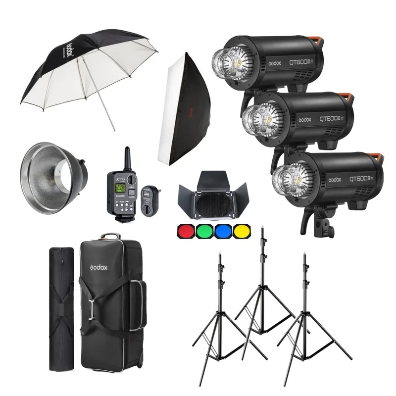 This complete set includes two QT600IIM, two tripods, a Softbox, a flash umbrella, remote control, a Barndoorn kit, a reflector and store in the appropriate carrying bags.