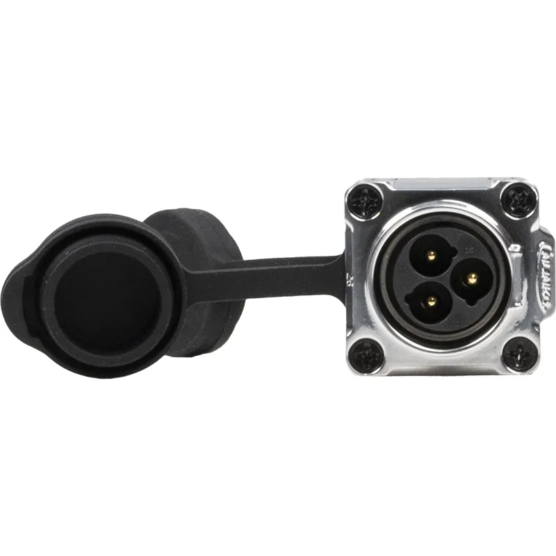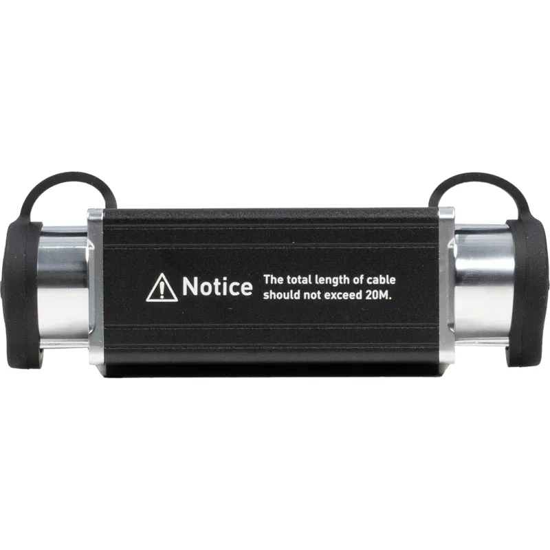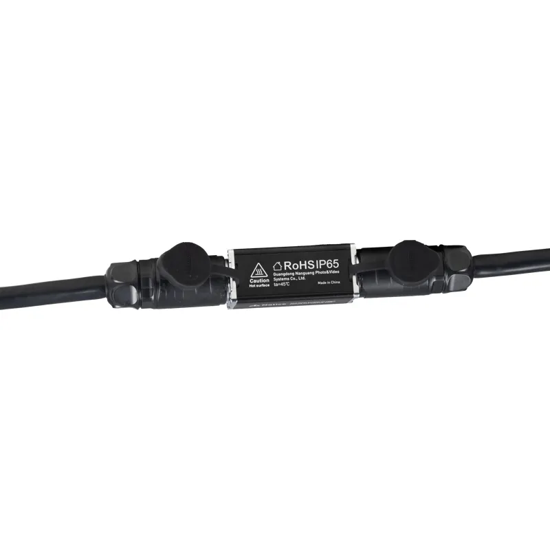 Used to couple two DC connection cables to extend the power supply distance. The symmetrical design at both ends of the coupler eliminates the need to distinguish the direction of cable plug connection. The coupler features an aviation connector compatible with a self-locking aviation plug, enabling quick and stable connection. It boasts an excellent protection rating (IP65), making it suitable for use in rain, snow, and dusty environments, ensuring electrical safety on set. It is equipped with waterproof covers to effectively prevent external moisture from entering in case of improper storage.