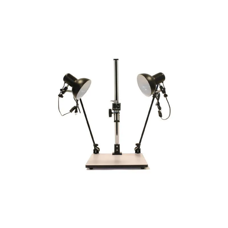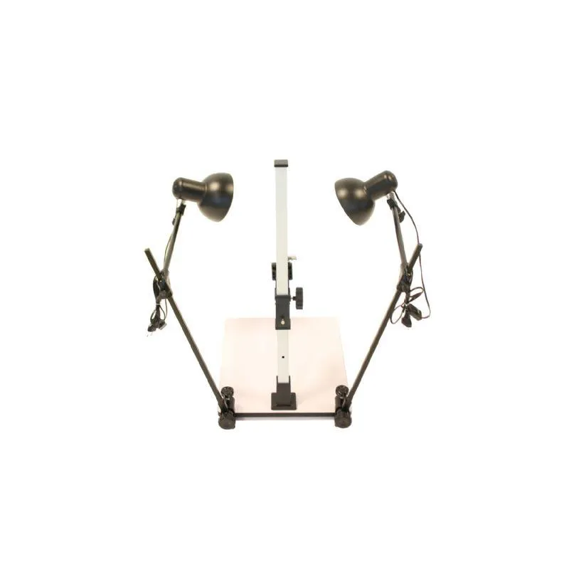The Studio King CS-104 Copy Stand is equipped with 2 lamp holders with a diameter of 15,5cm, which can be placed anywhere around the table to obtain your desired lighting. The CS-104 is also equipped with an adjustable camera mount, enabling you to fix your camera in the right position. The camera can be set to a maximum height of 65cm and the tabletop has a dimension of 48 x 40 x 1cm, the total set-up has a weight of 6 kg. Both lamp holders are equipped with an E27 socket and the compatible lamps can be found in the optional accessories tab below (max. 250W).