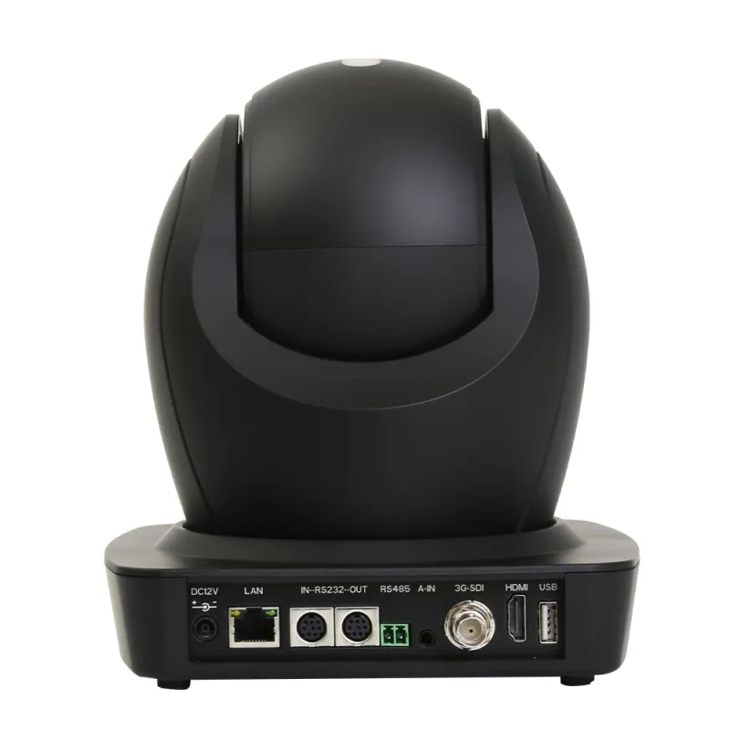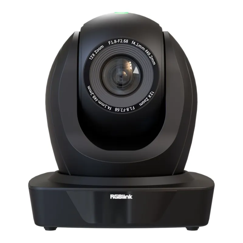The RGBlink VUE PTZ Camera features a sleek black design and a tally LED light, making it perfect for small productions, live events, and educational settings. It offers fast, silent rotation and zoom capabilities, delivering high-quality video output via HDMI, 3G-SDI, USB 2.0, or IP streaming at up to 1080p60, even in low-light conditions.