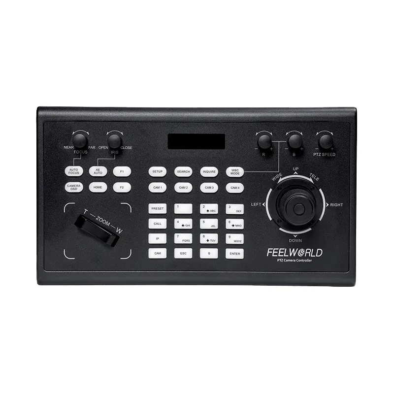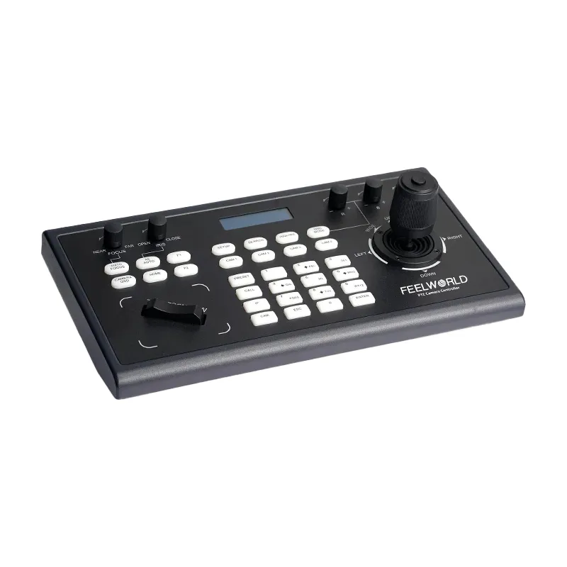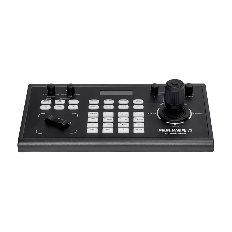 The KBC10 PTZ Camera Controller with Joystick from FeelWorld is compatible with any PTZ camera that uses the ONVIF, IP VISCA, VISCA, and Pelco-D/P serial protocols. It can be set up over Ethernet, RS-232 DB-9, and RS-422 5-pin terminal ports to control up to 255 cameras. It can control cameras over twisted-pair cable from up to 1200 meters away.
