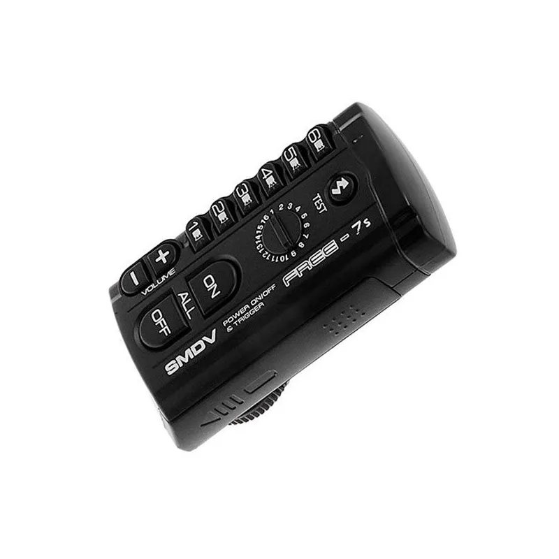 The SMDV Free-7s Professional Radio Slave Kit is a complete set to trigger a 220 Volt flash head from a distance of about 30 meters. With sixteen standard channels and six separate groups, the Fee-7s is ideal for working in busy locations or with multiple lighting setups. You attach the transmitter to the hot shoe of your camera. The receiver connects to the flash head.