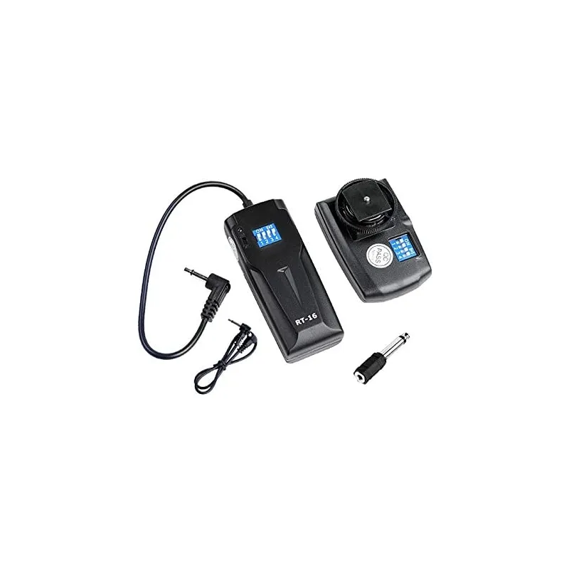The Godox RT-16 Studio Flash Trigger is a trigger set consisting of a transmitter and a receiver to trigger a studio flash head remotely. This set has sixteen channels and operates at a frequency of 433MHz. In the open field, the set has a range of about 30m. You can control several receivers with the transmitter. The transmitter is connected to the hot shoe or the PC port of the camera. Both the receiver and the transmitter are equipped with an LED to check the operation. The transmitter is powered by one 12V23A battery and the receiver by two AAA batteries.
