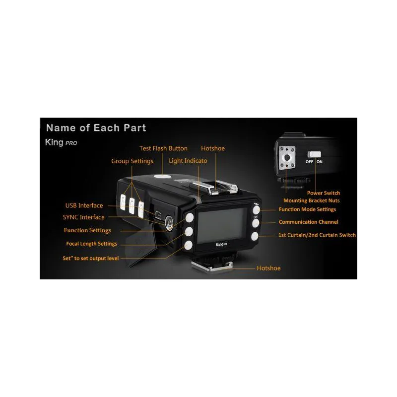 The Pixel TX King Pro Transceiver is a sender and receiver in one. The Pixel TX King Pro Transceiver supports both, manual and automatic TTL communication with the camera and has a range of 300 meters. Further, with the TX King Pro Receiver, EV corrections, sync-mode (1st/2nd curtain, highspeed sync etc.), zoom settings and flash bracketing mode, can be set via the camera menu.