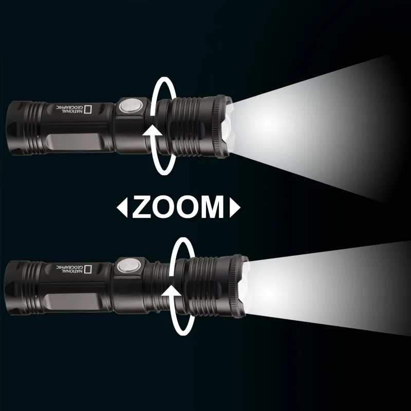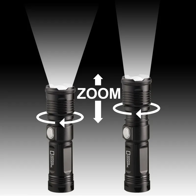 Small but feature-packed: The NATIONAL GEOGRAPHIC ILUMINOS 1000 LED Zoom torch 1000 lm weighs just 107 g and is ideal for outdoor adventures. Despite its compact design, the small torch is packed with features. Whether youre on a cave tour or camping in a tent, the powerful 1000 lm light will shine white light into any dark corner. It is also highly versatile, featuring a zoom focus that allows you to quickly adjust the light beam . You can direct a wide beam of light at your immediate vicinity, or focus on more distant objects. With this torch , you will quite literally see your surroundings in a different light.