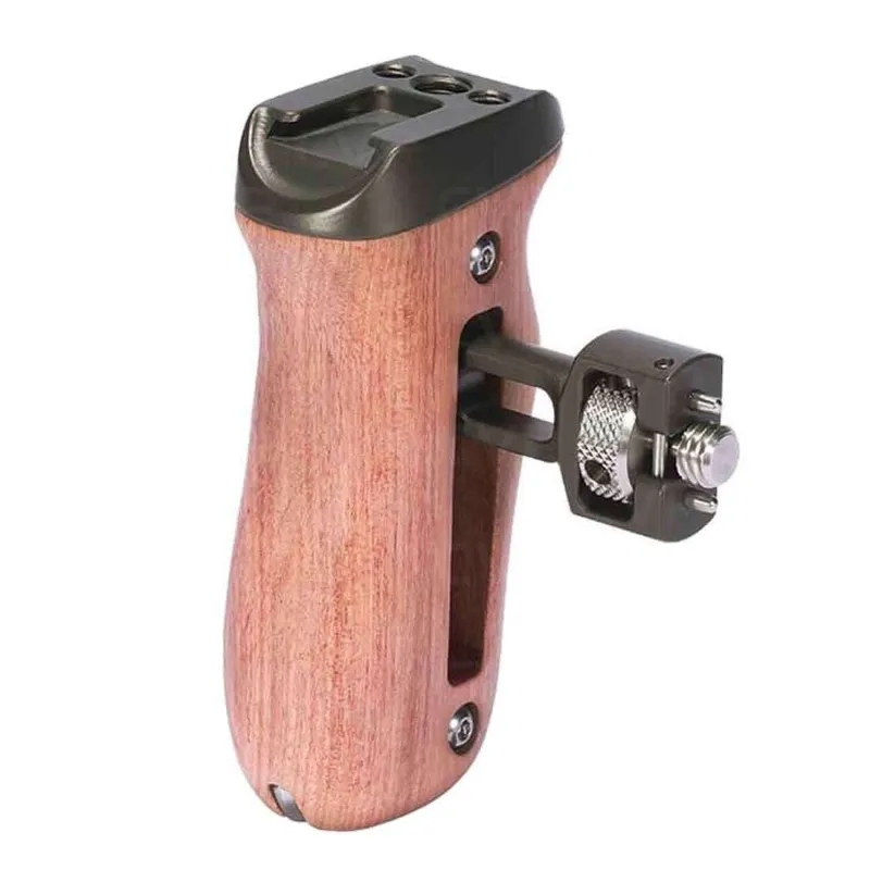 SmallRig Wood Side Handle with ARRI-Style Mount HSS2642 is designed to provide a comfortable grip for increasing stabilization and accessory mounts for cameramen. The handle attaches to the cage or camera rig via an ARRI 3/8“-16 screw with two locating pins. The handle can be configured for right or left Hand by detaching the metal connector. Featuring 3/8”-16, 1/4“-20 and cold shoe accessory mounts on top to add a mounting arm, light, mic or other accessories. The screws attach to a sliding mechanism that allows you to slide the handle up and down for your preferred position. A built-in Allen wrench inside the bottom allows to adjust the handle position and for further secure. The smooth wood handle provides a solid, comfortable grip and it also works well in the situation of low temperature.