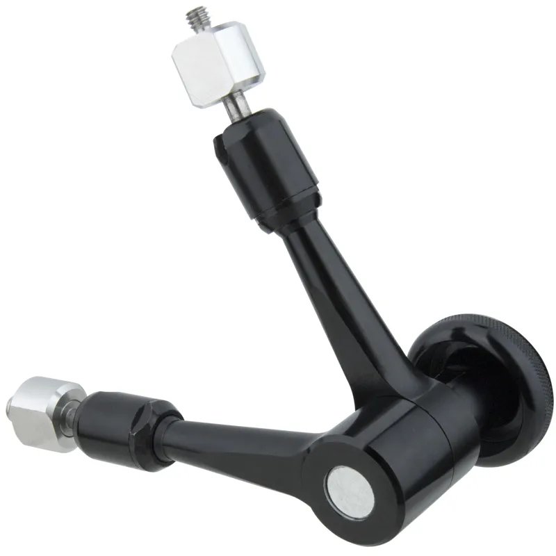 The friction wheel controls ball-joint tension simultaneously, making the arm handy and convenient to operate. The ends are engineered for 360-degree rotation plus 90-degree pivoting, providing great versatility for easy positioning. One end features a 1/4-20 male stainless steel accessory tip, and the other end has a 3/8-16 male stainless steel accessory tip.
