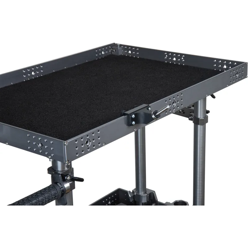 This stabilizer arm holder is fixed with a rail clamp to dock the steadicam stabilizer arm on the camera cart. The rail clamp is easy to fit into the edge of the shelf on the cart, using tightening knobs that accept a maximum thickness of 6mm on the side. A stainless steel stud supports stabilizer arms that have a hollow receiver of 8mm in diameter or larger.