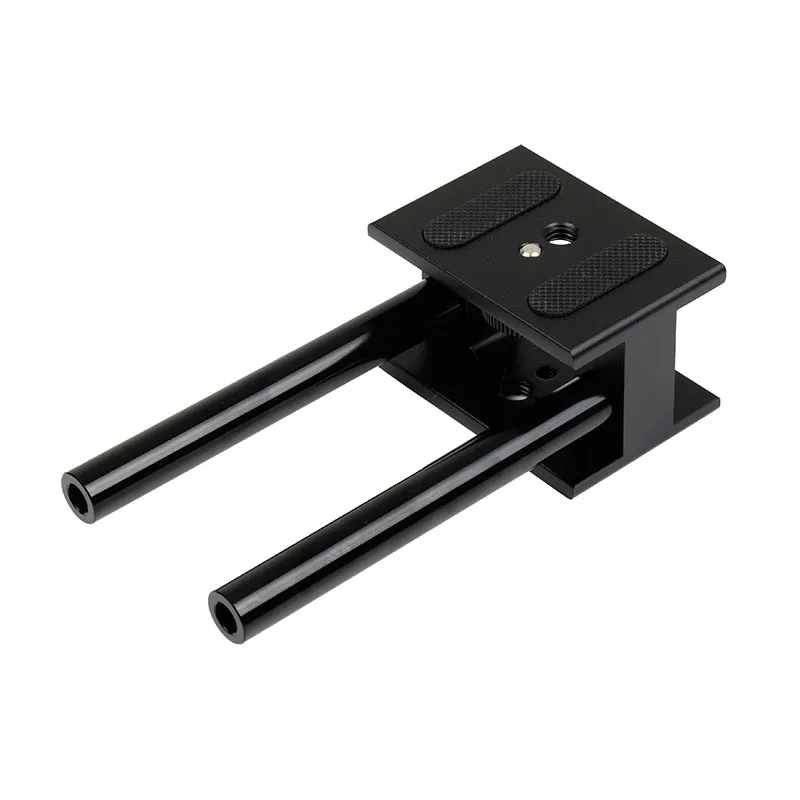 This connector is fitted with a 1/4 screw and has two 15mm rods at the front to which you can attach the accessories. Your camera will not slide quickly, because this connector is covered with rubber. ,