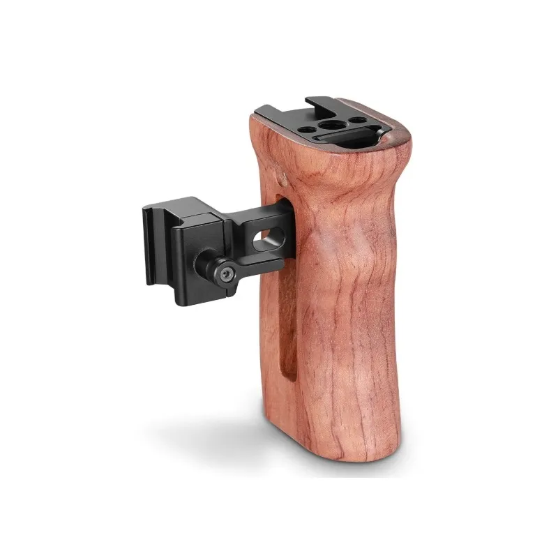 SmallRig Wooden NATO Side Handle 2187 is designed to provide a comfortable handheld shooting for cameramen. It is locked via NATO clamp to make your setup quick release and fits any cage featuring NATO rail on side. A built-in hex on the top to adjust the handle up and down based on your needs. If you want to use it on the other side of the cage, use the hex to take off the connection metal part of handle and change the direction. The quick release handle features a cold shoe and 1/4”-20 & 3/8”-16 threaded holes on top allows for mounting accessories.