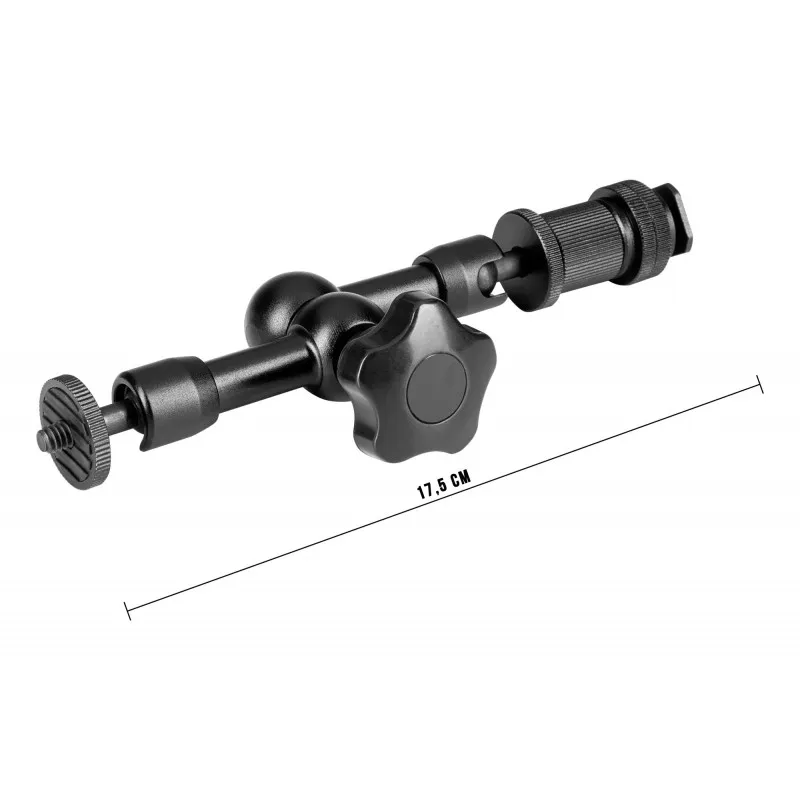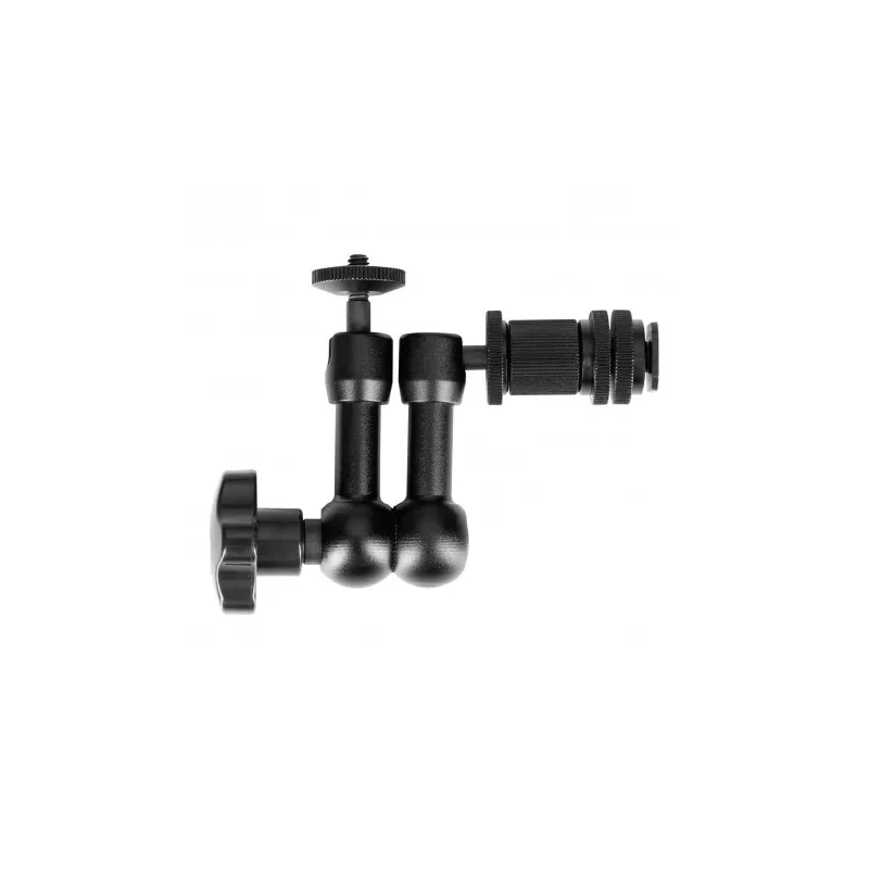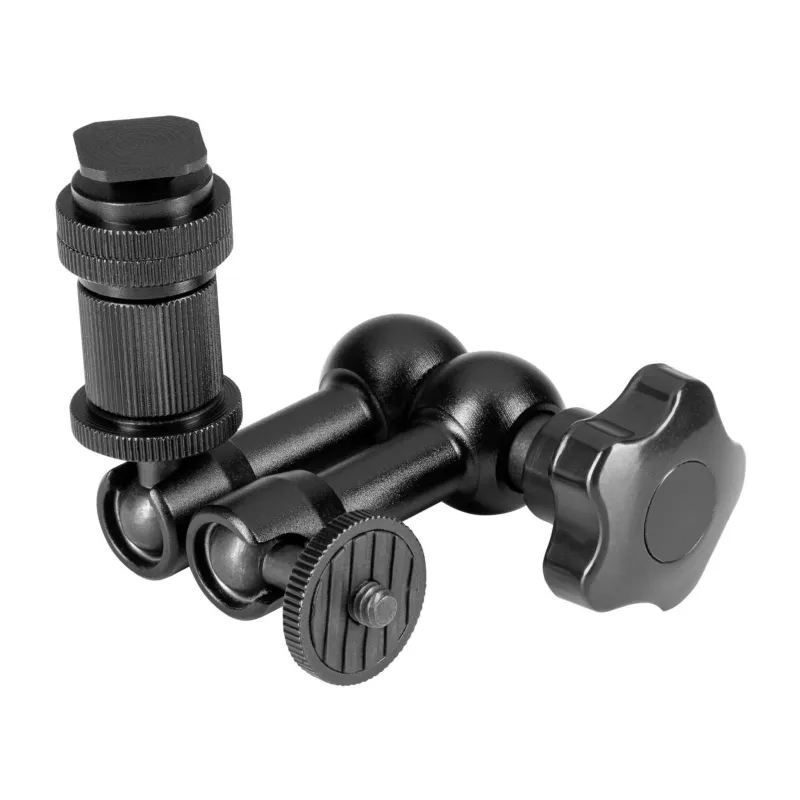 The arm heads are equipped with a standard 1/4-inch male tripod mount, compatible with most photographic and film equipment. An additional cold shoe pin allows the accessory to be directly installed on the camera sled.