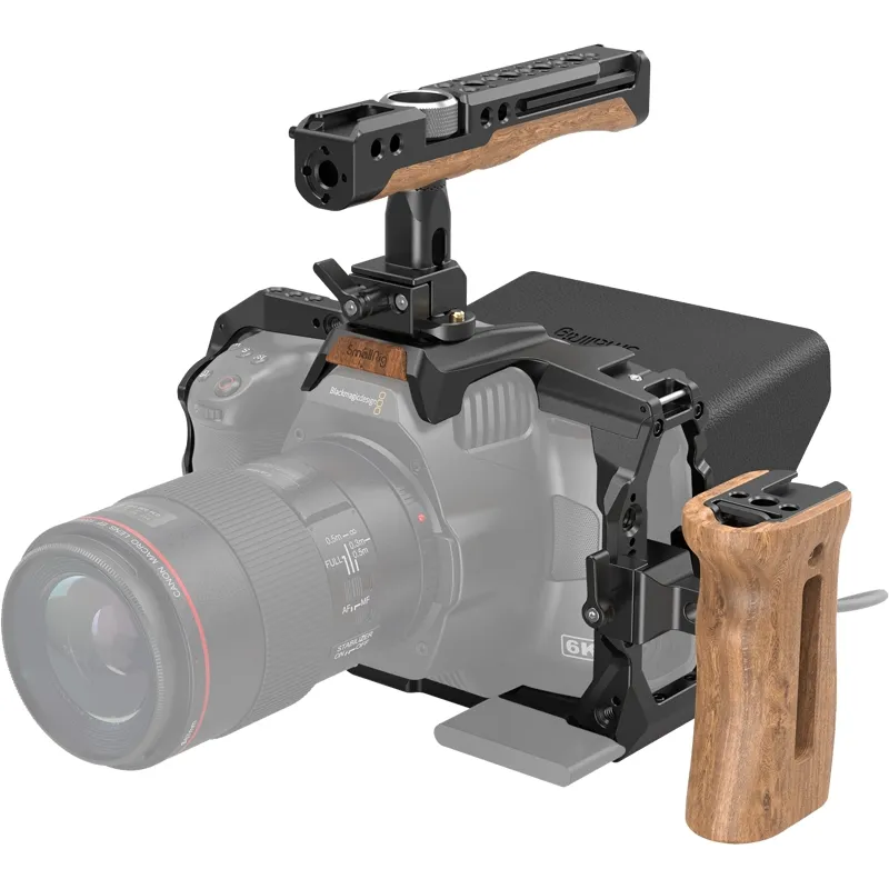 SmallRig Professional Accessory Kit for BMPCC 6K PRO 3299 features a durable aluminum-alloy cage with multiple 1/4"-20 threaded holes that support additional camera accessories. The NATO side handle fits the curve of hands for a comfortable grip and is designed for quick assemble and disassembly. The sunhood is easily removable and does not interfere with the flip of the screen, hence a better screen display under strong outdoor light.