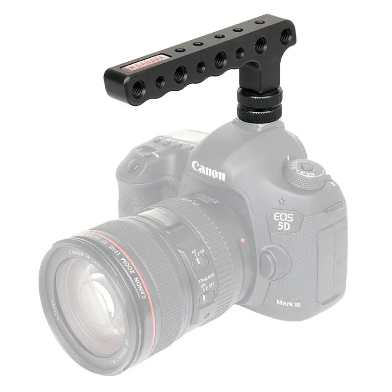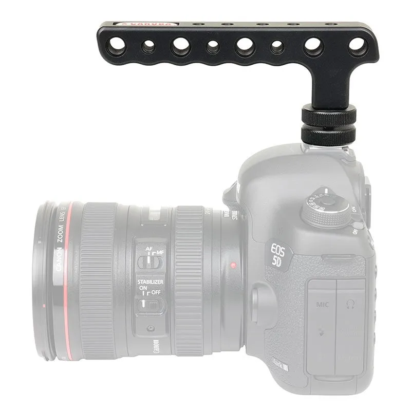 The Caruba Camera Handle Single is a lightweight handle that can be attached to the hot shoe connection of your camera. The handle is provided with several 1/4 and 3/8 screw holes for attaching accessories such as an external monitor or an LED lamp. This handy handle gives you a better grip when filming when you walk or want to film from a low position. ,