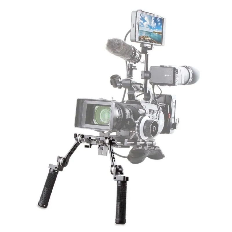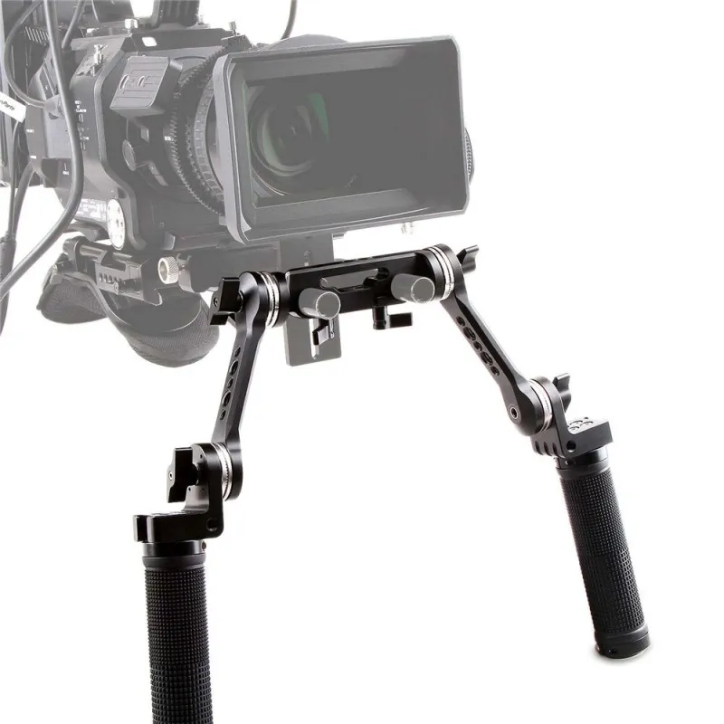 Attaches 15mm rods for shoulder mount shooting. Put the handgrips in front of your body for better camera control.