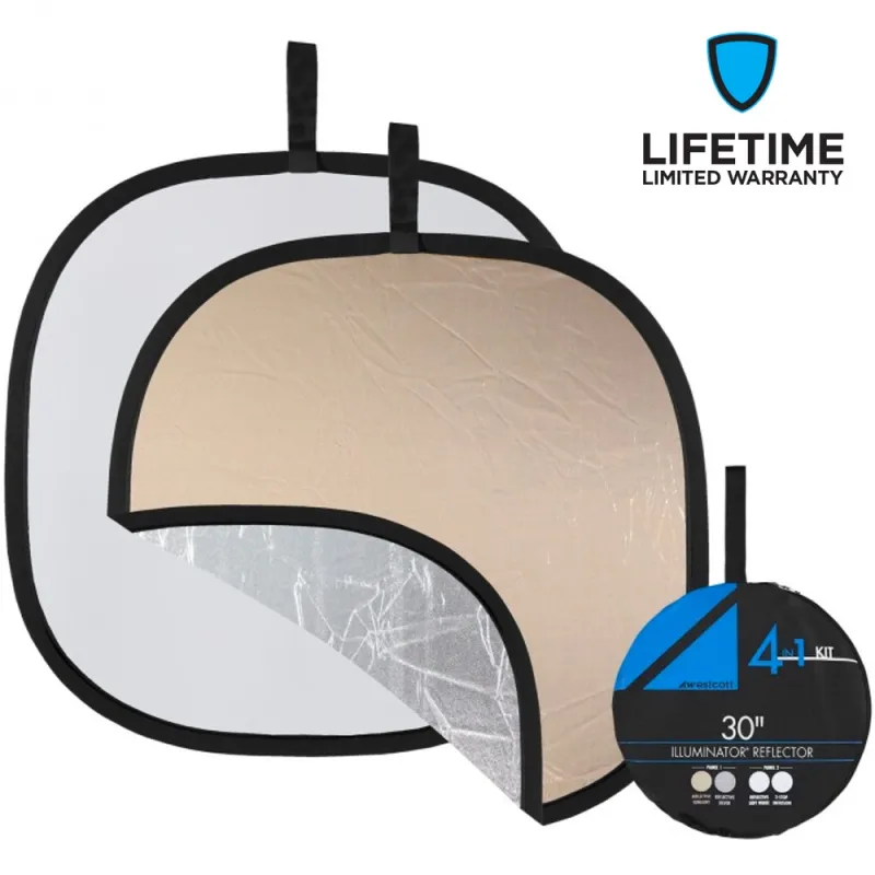 The Westcott Illuminator 30 4 in 1 Sunlight/Silver Reflector kit provides you with two quick opening and storable reflectors that give you one diffuse, one silver, one soft gold and one white side.