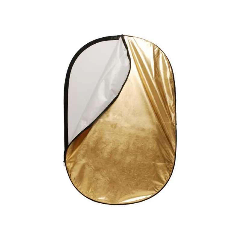 The Falcon Eyes RRK-3648SLG 5 in 1 Reflector is a standard diffuse reflector supplied with a removable cover. This removable, zip up cover is reversible and equipped with 4 different colours: white, gold, silver and sunny gold. The reflector is 92 cm wide, 122 cm long and can be folded and packed away in the supplied carry bag.