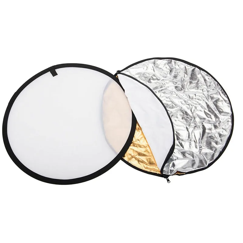 The base reflector is white diffuser. Additional covers can be fastened with velcro. Following covers are included: white, black, silver, golden. Reflector can be folded for transport, case is included.