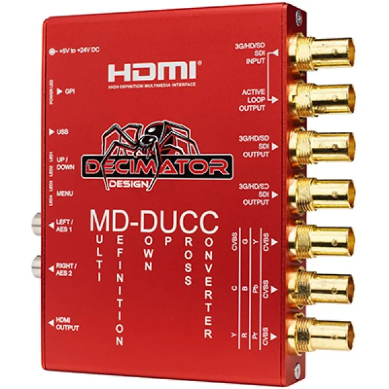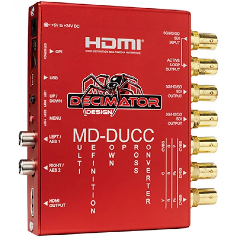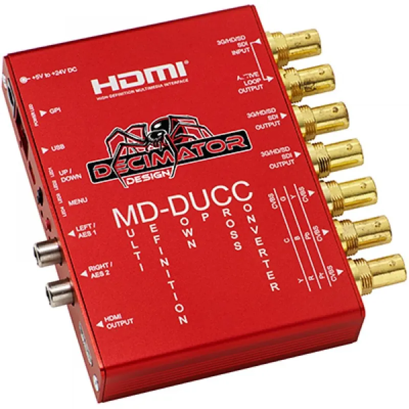 The MD-DUCC from Decimator Design is a must have for any broadcast professional; the variety of functions it performs eliminate the need for several products. Input any format of SDI and select whatever output format you require - whether in SDI, HDMI, or analogue.