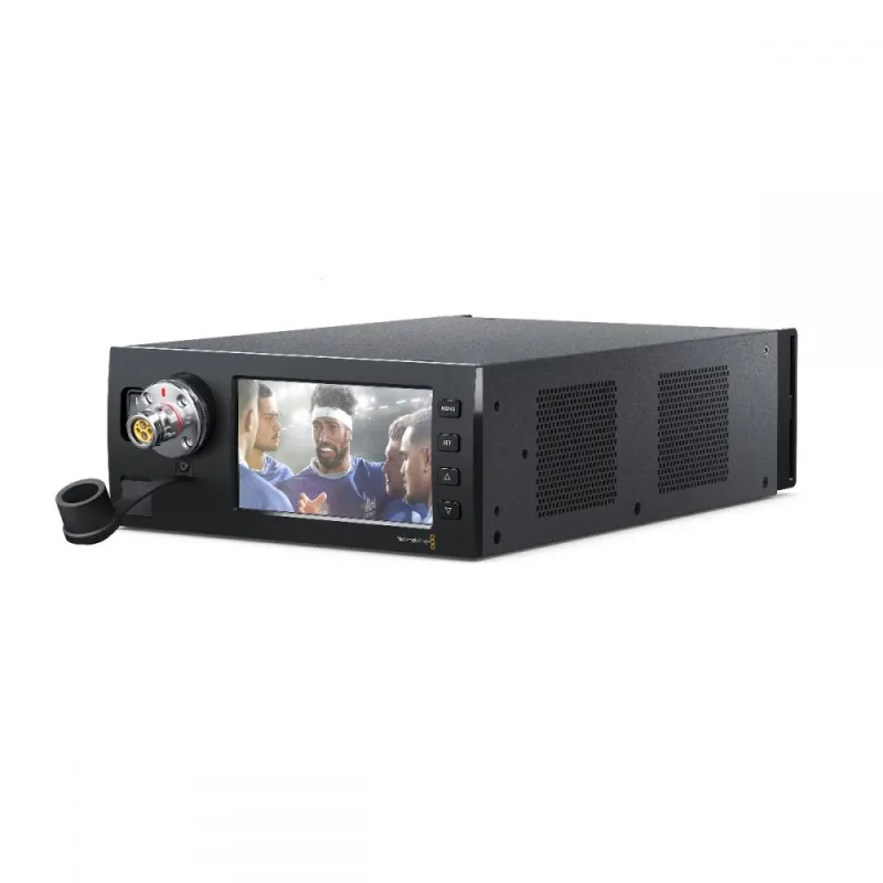 The Blackmagic Camera Fiber Converter features an extremely durable all metal design that perfectly matches URSA Broadcast, URSA Mini cameras or any camera that supports a standard battery plate. It’s built to withstand the harsh demands of outdoor field production and 24/7 operation. The Blackmagic Camera Fiber Converter features full size standard television industry connections with dust caps, along with an integrated VLock mount plate on top for adding a studio viewfinder. The Blackmagic Studio Fiber Converter is designed so that you can fit two of them side by side in a standard equipment rack using the optional rack mount kit. The optical fiber connector on the Blackmagic Studio Fiber Converter is conveniently located on the front panel, right next to the built in 5 inch LCD, so you can plug remote cameras in and instantly see the feed!