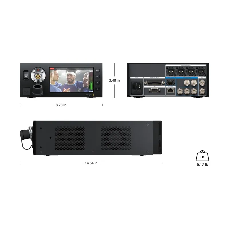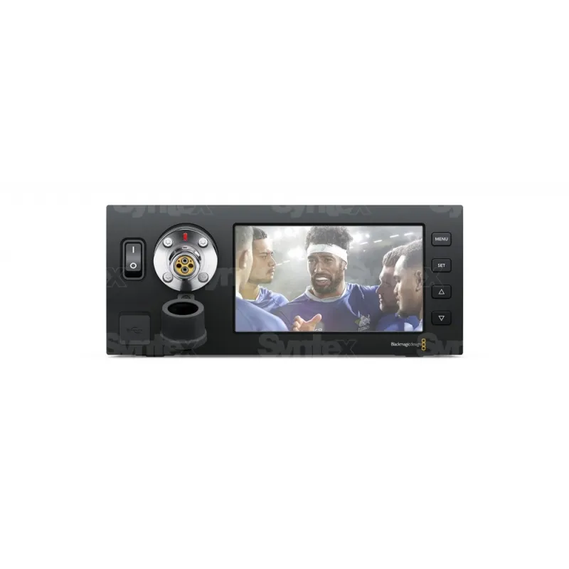 The Blackmagic Camera Fiber Converter has a very robust metal body and a design that perfectly matches the URSA Broadcast camera. Of course, there are dust seals on the connectors or a top quality V-Lock interface for connecting the Blackmagic Studio Viewfinder monitor. The Blackmagic Studio Fiber Converter studio model is designed to be rack mounted in a standard width rack (using an optional adapter) and hosts both a camera connector and a 5 LCD display on its front panel for instant signal preview
