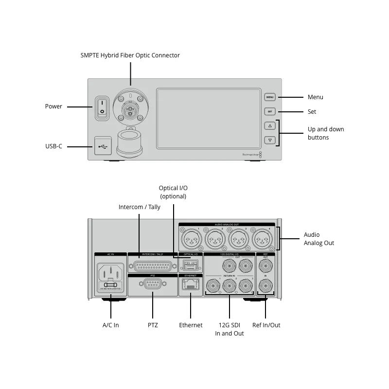 The Blackmagic Camera Fiber Converter and Blackmagic Studio Fiber Converter convert standard connections for video, audio, power and communications into a single hybrid electro-optic interface. This allows cameras to be operated up to 2 km away from the overhead or transmission truck using a single cable!