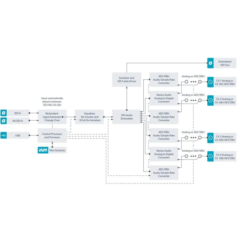 Includes everything you need to embed 4 channels of analog audio, or 8 channels of AES/EBU digital audio into any SDI video connection. Embed audio from devices such as audio mixers and analog decks into SDI video connections for use with SDI routers and decks or to add extra audio channels to video converters!