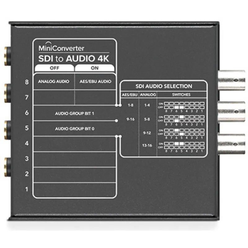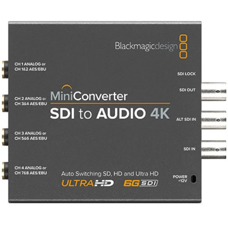 Mini Converter SDI to Audio 4K includes everything you need to de-embed 4 channels of analog audio or 8 channels of AES/EBU digital audio from any SDI video connection. Now you can access the audio in any SDI video connection for output to a massive range of audio equipment such as audio mixers, analog broadcast decks, audio monitors and more!