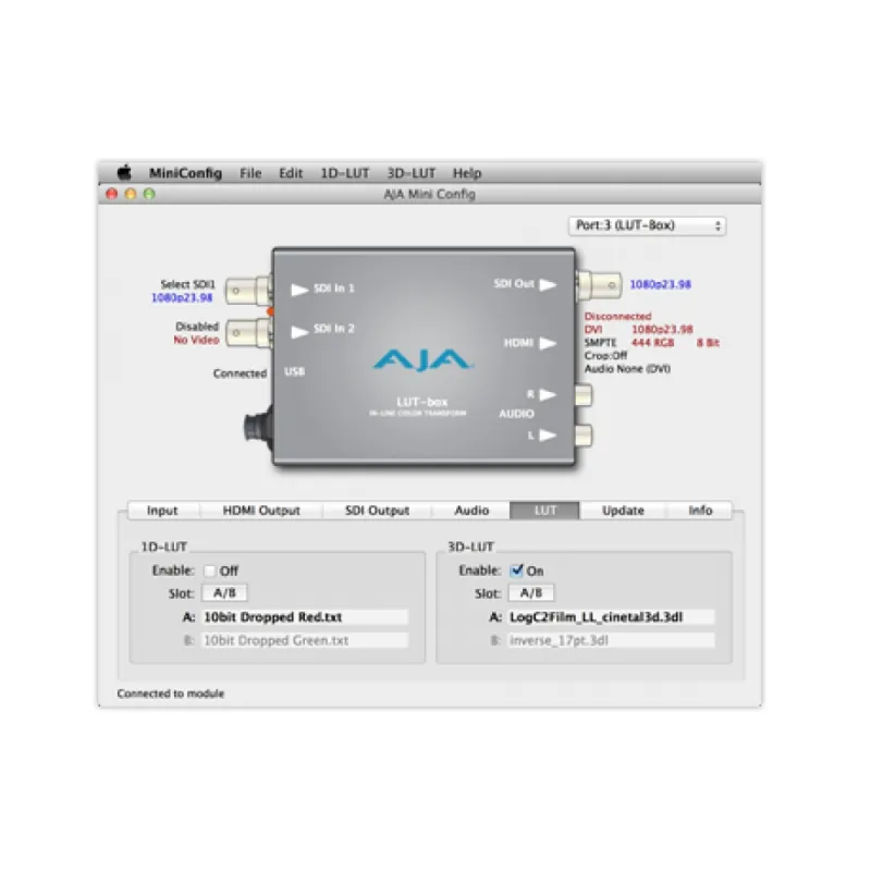 AJA’s free Mini-Config software can be used with any USB-enabled AJA Mini-Converter and provides an easy-to-use graphical interface with detailed information about the current input and output formats. Control all the parameters of any supported AJA Mini-Converter as well as loading firmware updates from AJA that add new features and functionality.