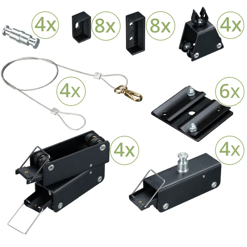 Of course, the mounting accessories are included in the set and if that is not enough, you can expand the system with our optionally availabe accessories and thus individually adapt the size to the conditions.