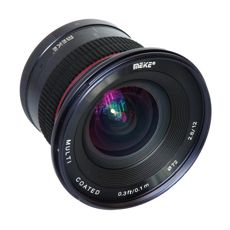 The optics are made up of twelve lens elements divided into ten groups. Each lens element is treated with a special multi-layer coating for excellent contrast and colour reproduction. The smoothly rotating focus and aperture rings make this 12mm lens easy and precise to operate. An all-aluminum body makes the Meike MK-12mm lens robust and durable. A handy pouch and microfiber cleaning cloth are included.