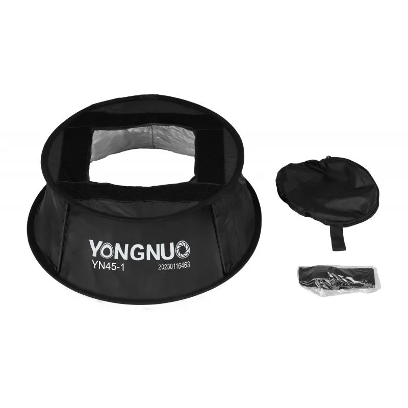 The Yongnuo YN45-1 softbox is a compact and powerful light modifier with a diameter of 45 cm, designed to work with Yongnuo YN300 series lights. It provides soft, eye-pleasing lighting. It will get rid of harsh shadows that can adversely affect the quality of your photos and videos. Its silver-finished interior effectively reflects light, acting as a reflector. At the same time, a layer of white material provides optimal softness. A quick flick of the wrist is all it takes to unfold the Yongnuo YN45-1 softbox, and the sturdy Velcro fasteners allow instant and solid connection to the flash. It also comes with a practical carrying case for easy storage and transportation. Main product features softbox with a diameter of 45 cm compatible with Yongnuo YN300 series lights enables soft and eye-pleasing light enables you to get rid of harsh, unwanted shadows provides even distribution of light fast installation and removal installation with strong Velcro straps interior of cover finished with silver reflective coating ideal choice for vlogs, live broadcasts and portrait photography weighs just 180g case included Enjoyable light The Yongnuo YN45-1 softbox allows you to achieve eye-pleasing lighting. When paired with a Yongnuo YN300 series flash, you will soften the light and eliminate deep and harsh shadows. Thanks to the inner walls made of silver coating, the softbox acts like a reflector, which contributes to even more effective operation. A layer of white diffusion material allows you to achieve even light dispersion. Whether you're a professional photographer or a vlogging enthusiast, the Yongnuo YN45-1 softbox will help you create even better videos or photos. Fast installation After removing the Yongnuo YN45-1 softbox from the included carrying case, it takes just one hand movement to unfold the 45 cm diameter structure. You will connect the light modifier to the lamp with sturdy Velcro straps. Mounting and dismounting the softbox is quick and easy, so you can concentrate on your work without wasting time struggling with the fasteners. Compatibility Lamps from the YN300 series: Yongnuo YN300 III - WB (5500 K) Yongnuo YN300 III - WB (3200 K - 5500 K) Yongnuo YN300 IV - RGB, WB (3200 K - 5600 K) SOFTBOX IS NOT COMPATIBLE WITH YN300 AIR-series lamps. Specification model: Yongnuo YN45-1 Diameter: folded: 45 cm folded: 17 cm weight: 180 g Set contents softbox Yongnuo YN45-1 mounting straps case