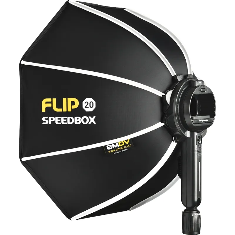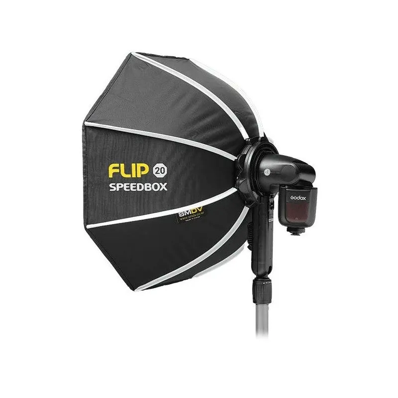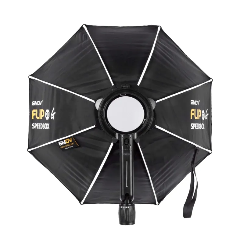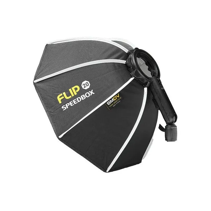 The SMDV Speedbox Flip-20 softbox is an extremely quick to set up, octagonal softbox. The Flip-20 has a diameter of 45 centimeters and is equipped with a practical folding system, so you can quickly unfold and fold it. It comes in a handy carrying case.