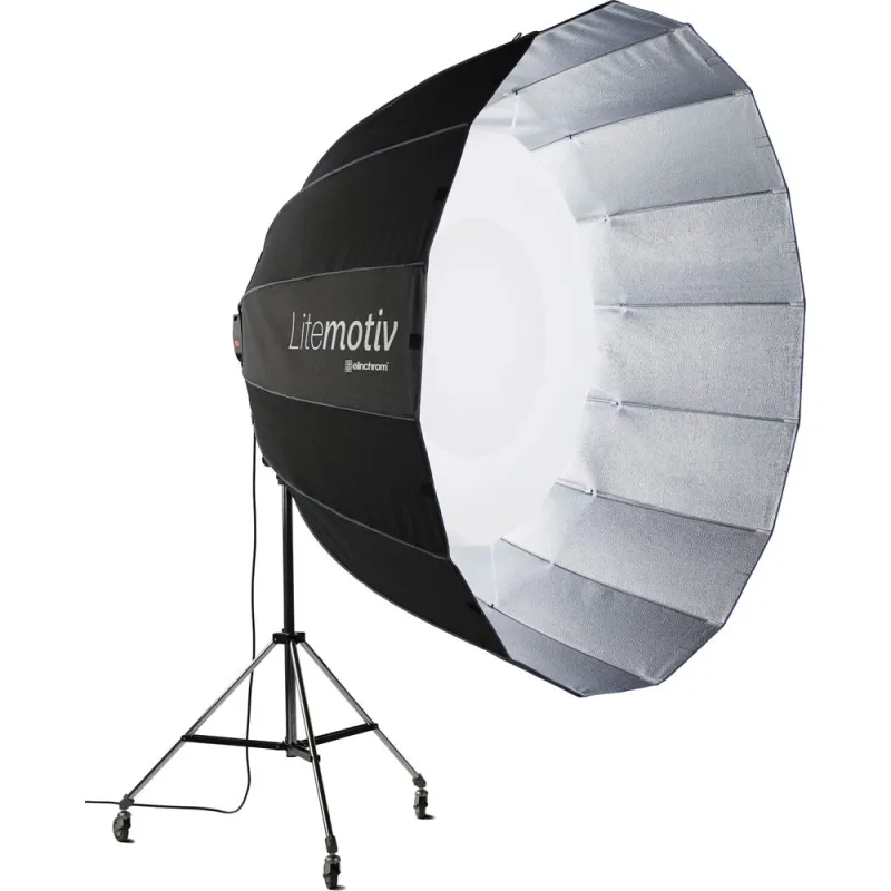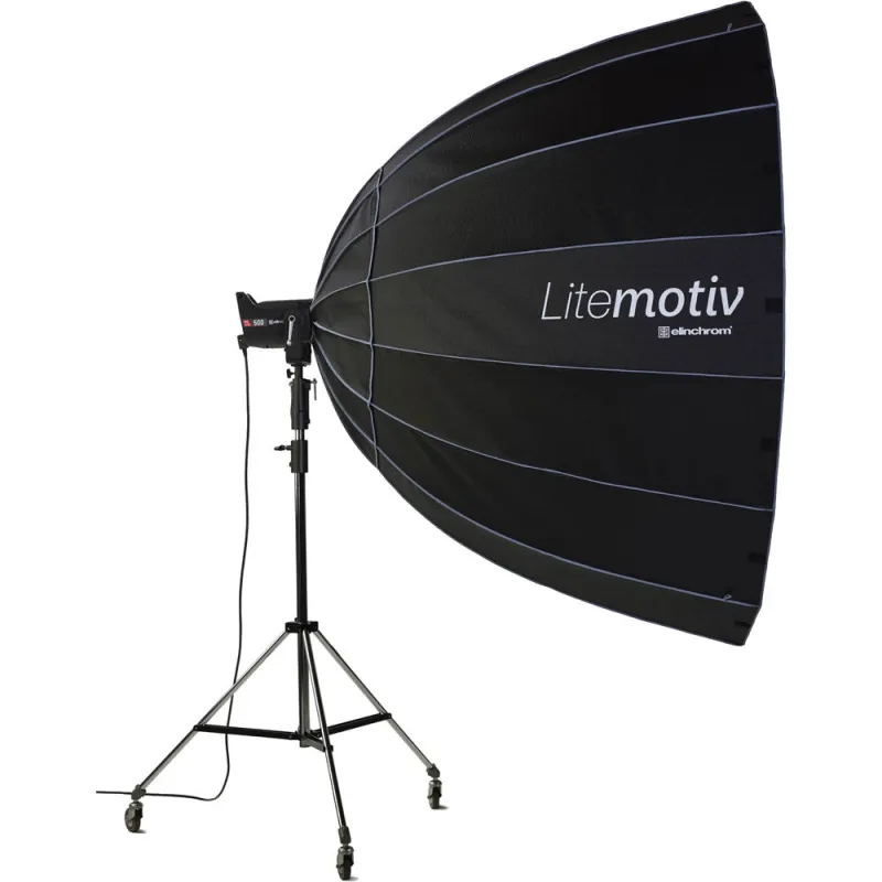 The Litemotiv 190cm Parabolic Softbox from Elinchrom is a logical extension of their softbox range. The 16-sided softbox is ideal for portraiture since its form factor renders pleasing circular catchlights in subject's eyes, while the Litemotiv's large surface area wraps the soft light around the subject.