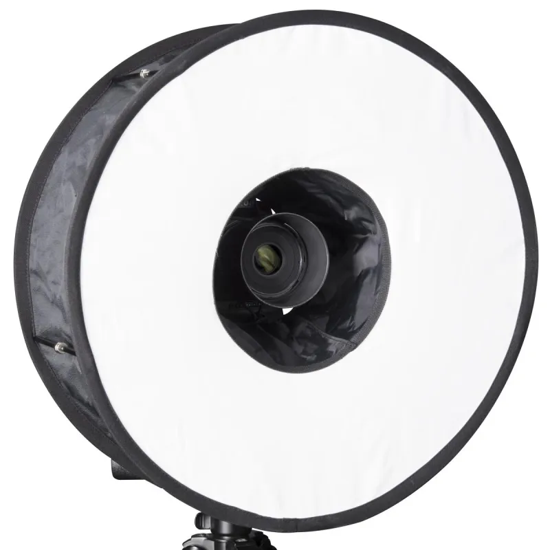 With its diameter of 46 cm, the RoundLight Softbox is the perfect ring flash diffuser. The large, uniformly illuminated surface completely surrounds your camera lens and produces almost shadow free images. Due to the large dimensions, the light of the shoe mount flash is reflected by an internal diffuser in the RoundLight Softbox in such a smart way, that an absolutely uniform light distribution is ensured. The result is an extremely uniform and soft illumination.