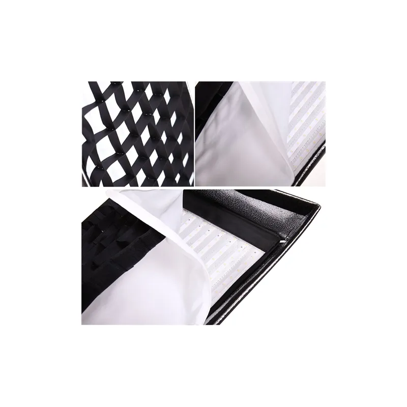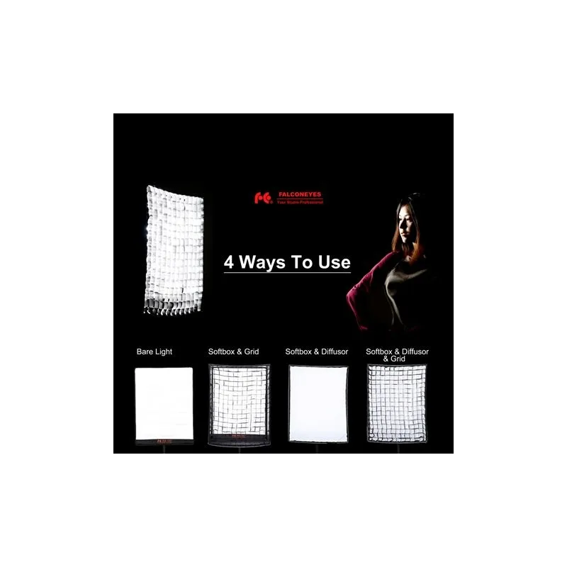 ;The Falcon Eyes softbox can easily be mounted on the LED panels using the simple Velcro system. Then you can mount the honeycomb with a velcro strap on the inside of the softbox.