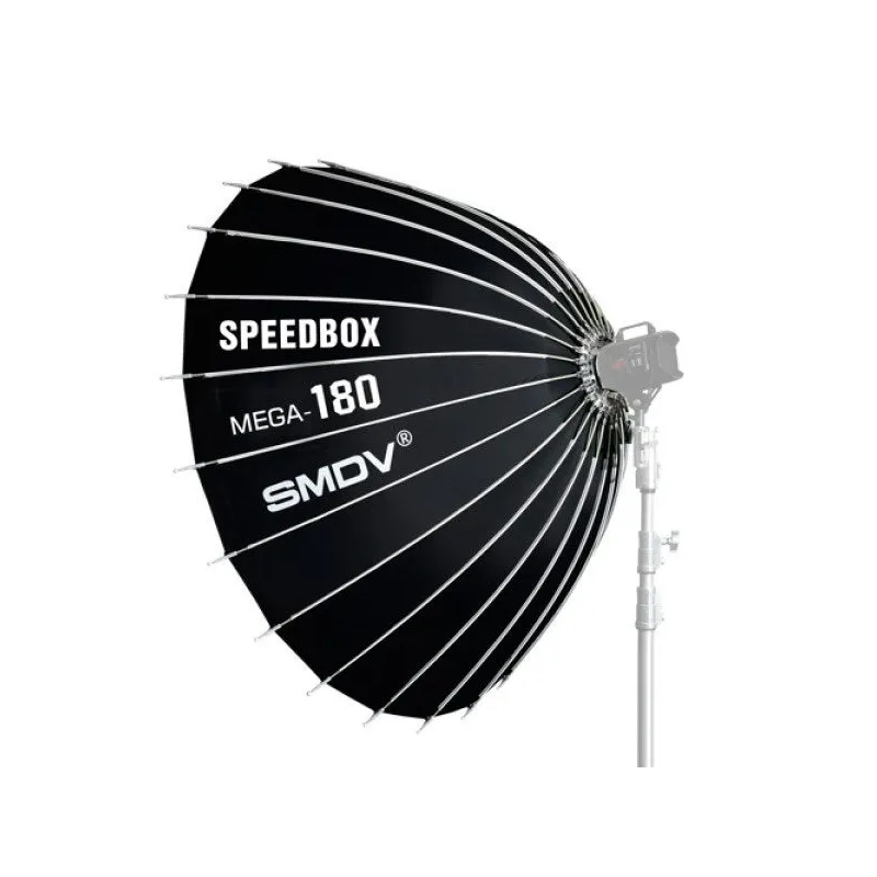 The SMDV Speedbox Mega 180 Deep Softbox Silver is a 24 sided softbox with a diameter of 180 cm. The materials are heat resistant and the speedring is made entirely of metal, with each of the 24 rods being detached individually when the reflector is folded down. This is ideal because it saves time when mounting and dismounting the diffuser. With the Speedbox you get a softer, diffused and more even lighting on the object to be photographed. The softbox comes with a Bowens speedring insert. ,