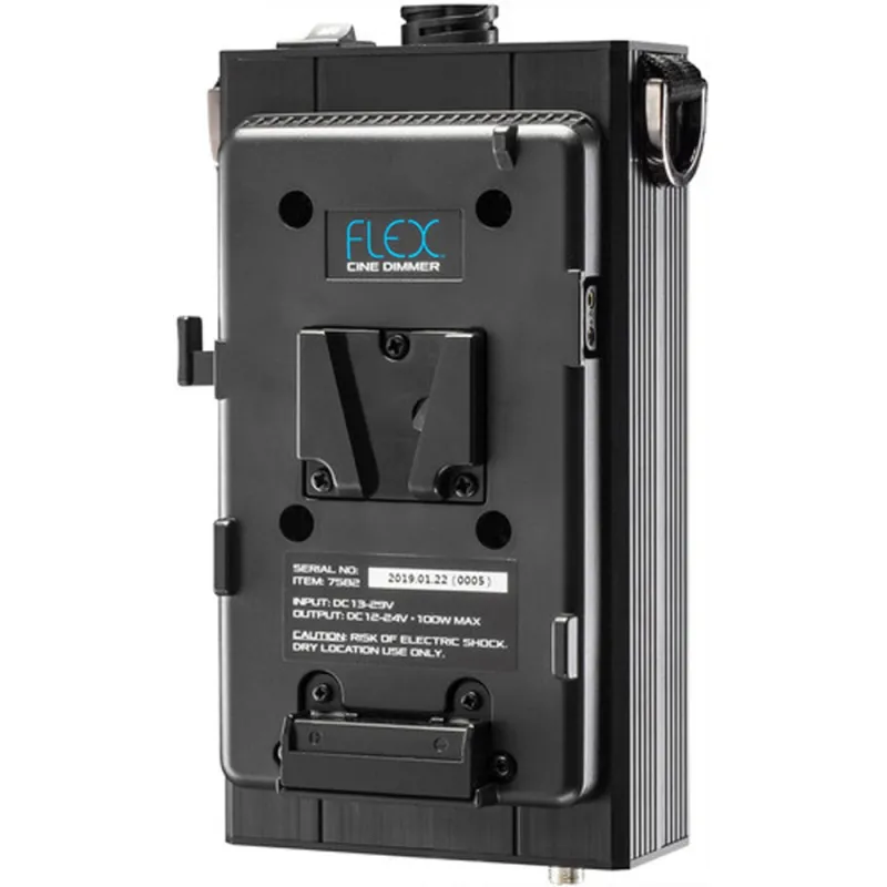 It can be powered with in-line AC Adapter, Flex Cine Wireless DMX Dimmer AC Adapter, 14.4-26V V-mount battery, or D-Tap battery via D-Tap to D-Tap cable.