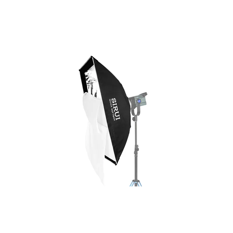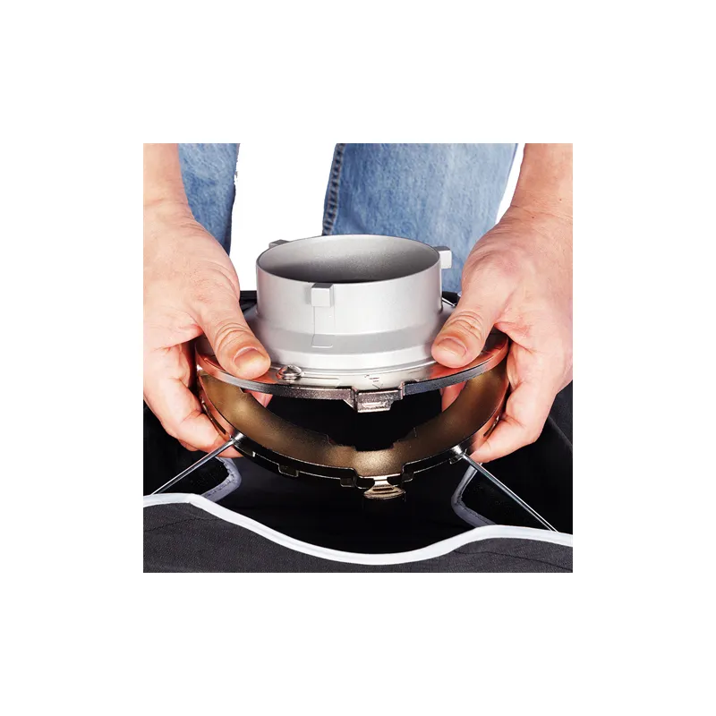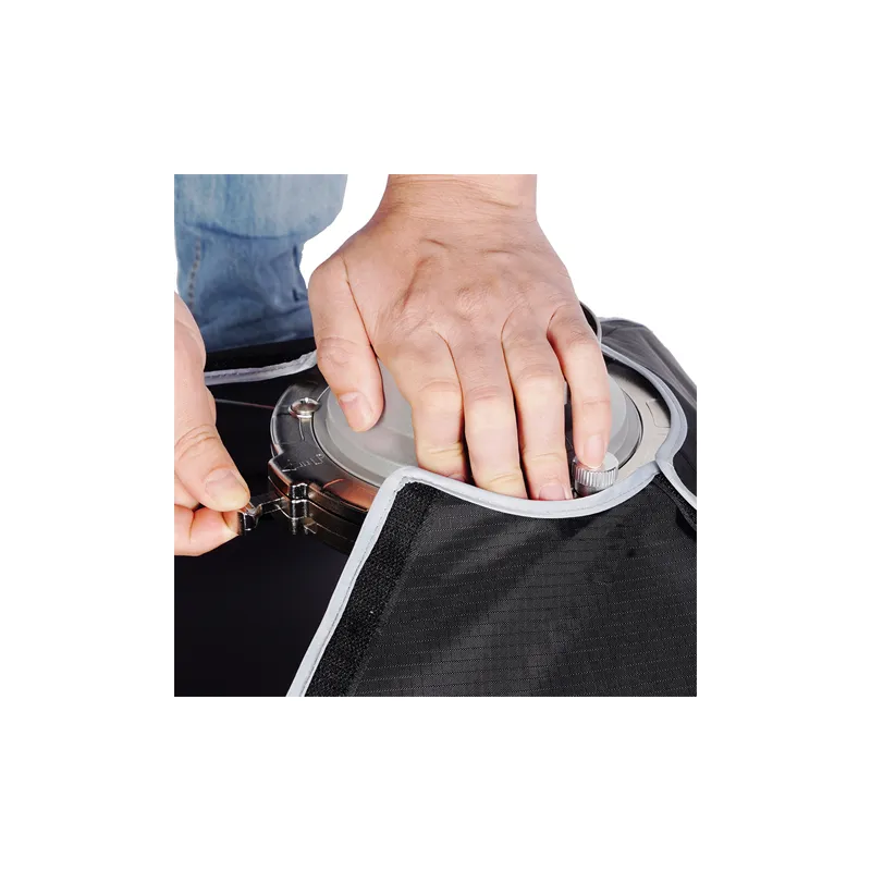 This QR6090 softbox from Sirui helps you spread the light just the way you want it. The special metal construction allows for easy folding in and out. Unfolding is done by a double folding ring that clicks into place (see photo 4). Once unfolded, the QR6090 softbox maintains its shape very well. When folded, it is compact and easy to carry in the included bag, along with all the supplied accessories. The Bowens connection is compatible with many light sources, such as Sirui, StudioKing, and Linkstar.