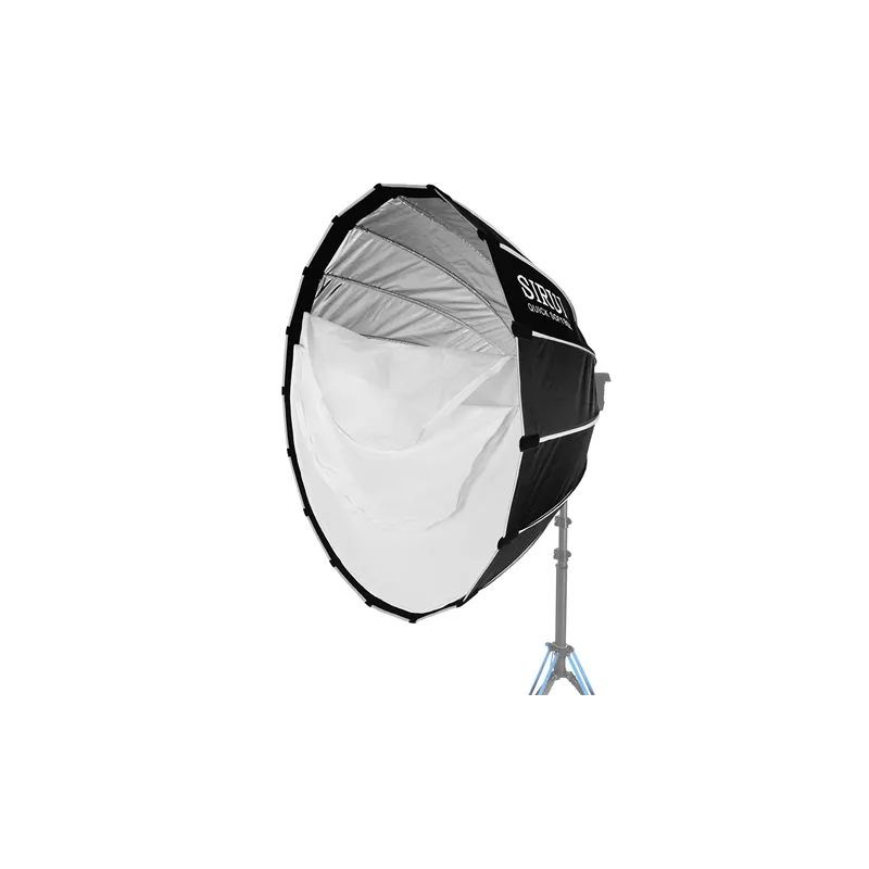 This QR90-DP softbox from Sirui helps you spread the light. Just the way you want it. You fold it in and out easily, thanks to the special metal construction. Once unfolded, the QR90-DP softbox keeps its shape very well. And when folded, the softbox is compact to take with you. You do that in the included bag. Nicely organized, together with all supplied accessories. The Bowens connection is suitable for many light sources. For example from Sirui, StudioKing, and Linkstar.