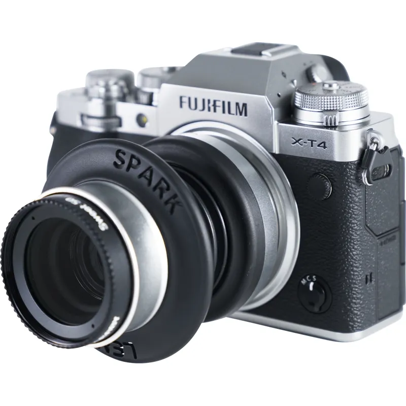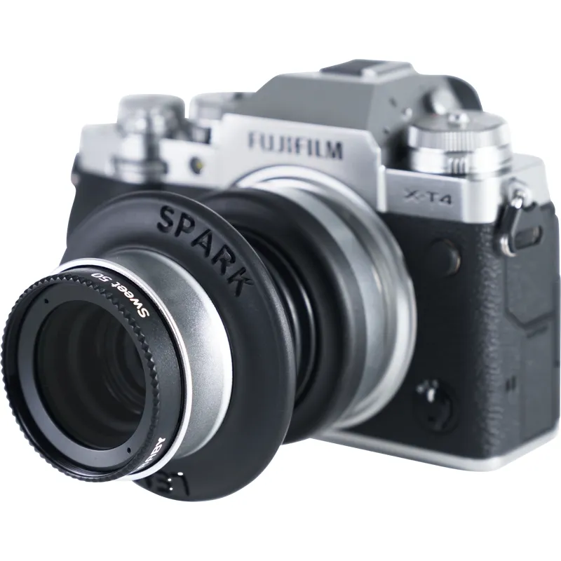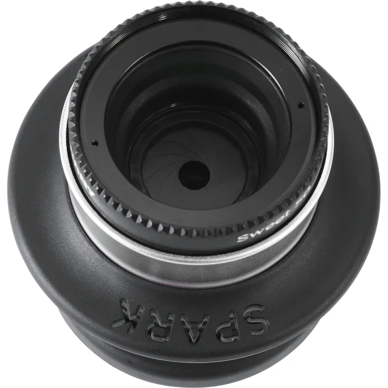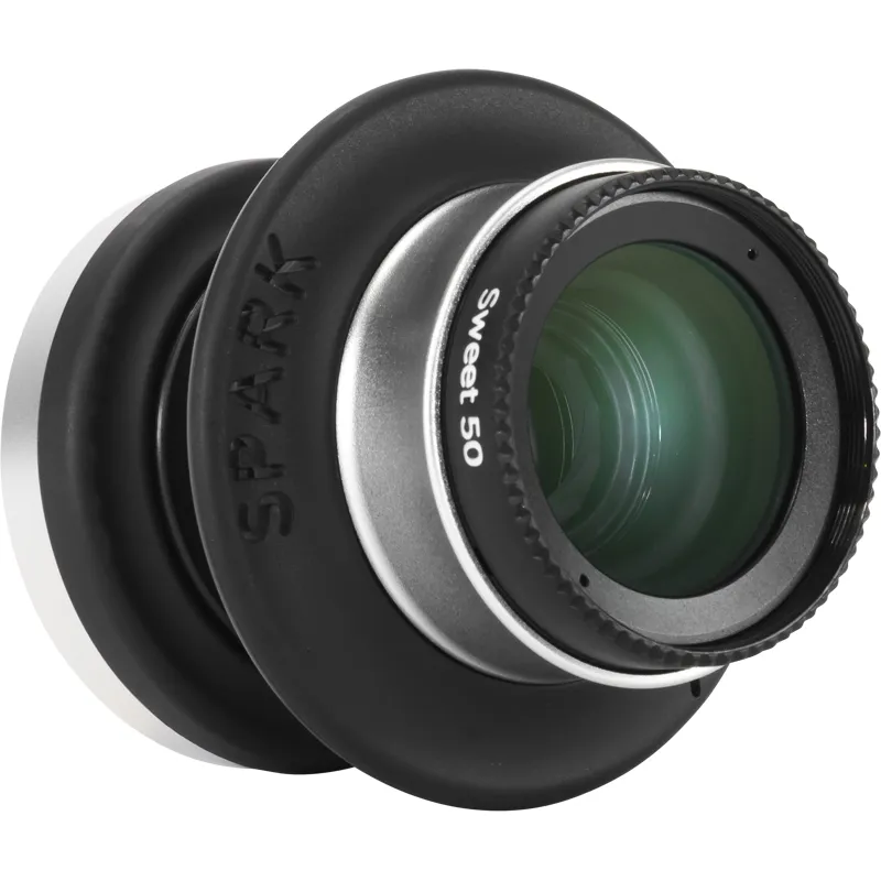 The Spark 2.0 comes with the Sweet 50 lens and can be tilted up to 15° in any direction. Focus is done by squeezing the lens back and forth and then tilted to find your focus area (sweet spot). Lens has an fixed f/2.5 aperture.