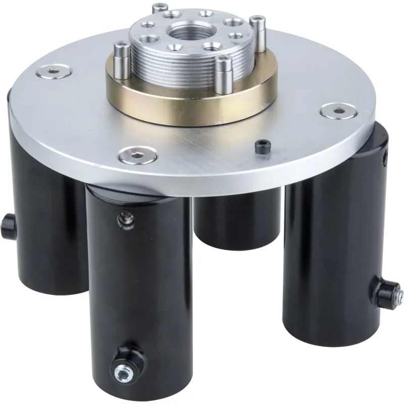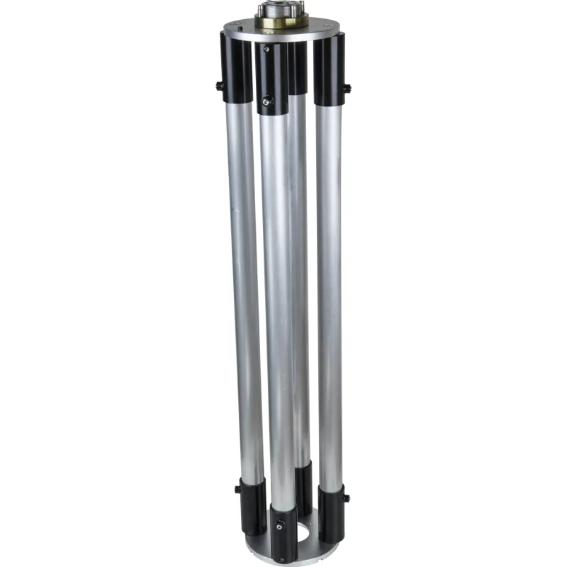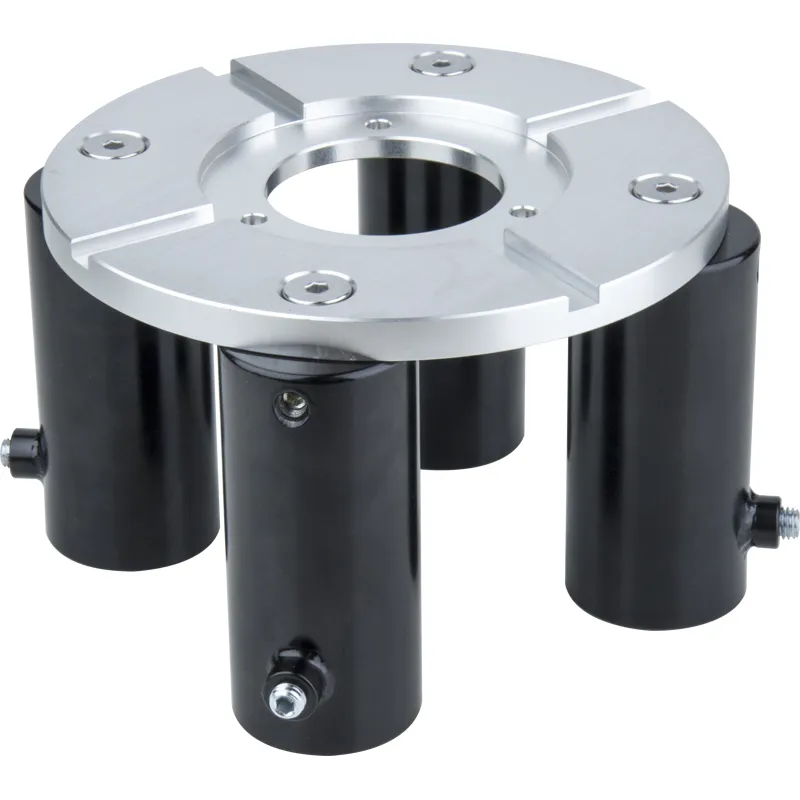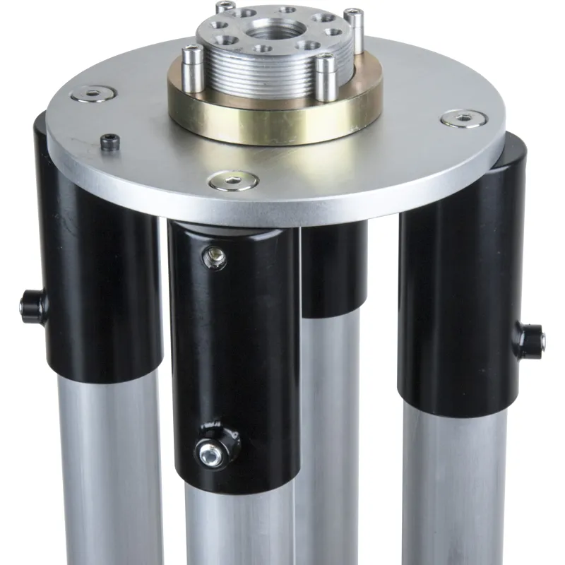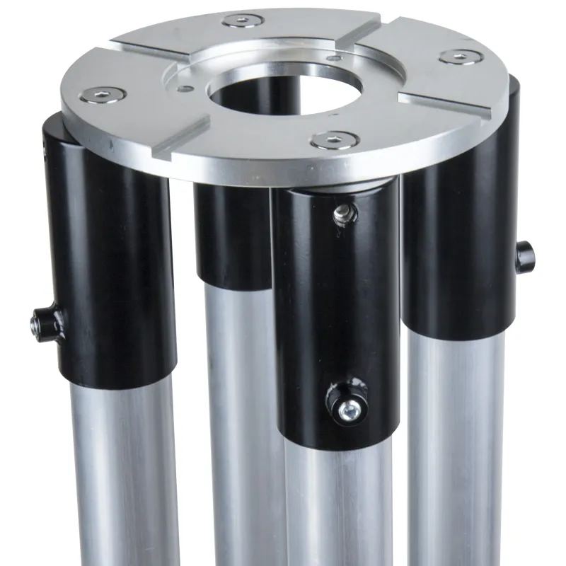 The Mitchell camera riser is designed with a Mitchell female on top, a Mitchell male on the bottom, and four steel pipe holders on each side. This configuration allows for customized height adjustments using 1-1/2 schedule 40 pipes (O.D. 48.3mm).