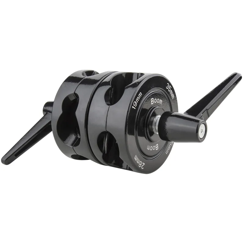 Designed for mounting a boom arm to a heavy-duty stand, this clamp is constructed with solid aluminum. It allows for quick and simple tilt and swivel adjustments of the boom arm using the metal ratcheted handle.