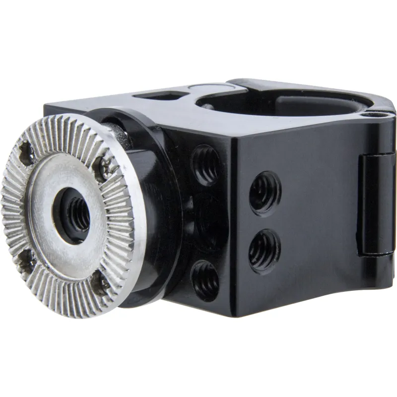 The lightweight aluminum tube mounting coupler is designed for DJI Ronin, Freefly Movipro, or any gimbal support system that accommodates a diameter of 25-30mm tubes. It features an M6 internal female thread, which is intended for mounting Arri standard rosette-style accessories, and allows for 360-degree rotation.