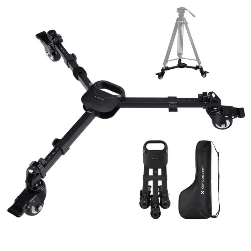 The K&F Photography Tripod Dolly is a robust accessory designed for professional photographers and videographers, offering stability and mobility during shoots. With a load capacity of 44lbs, it features adjustable legs, durable aluminum construction, and smooth, silent wheels for convenient shooting.