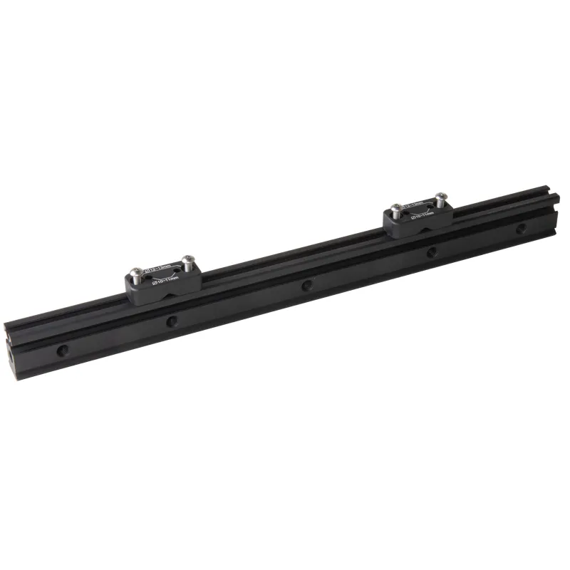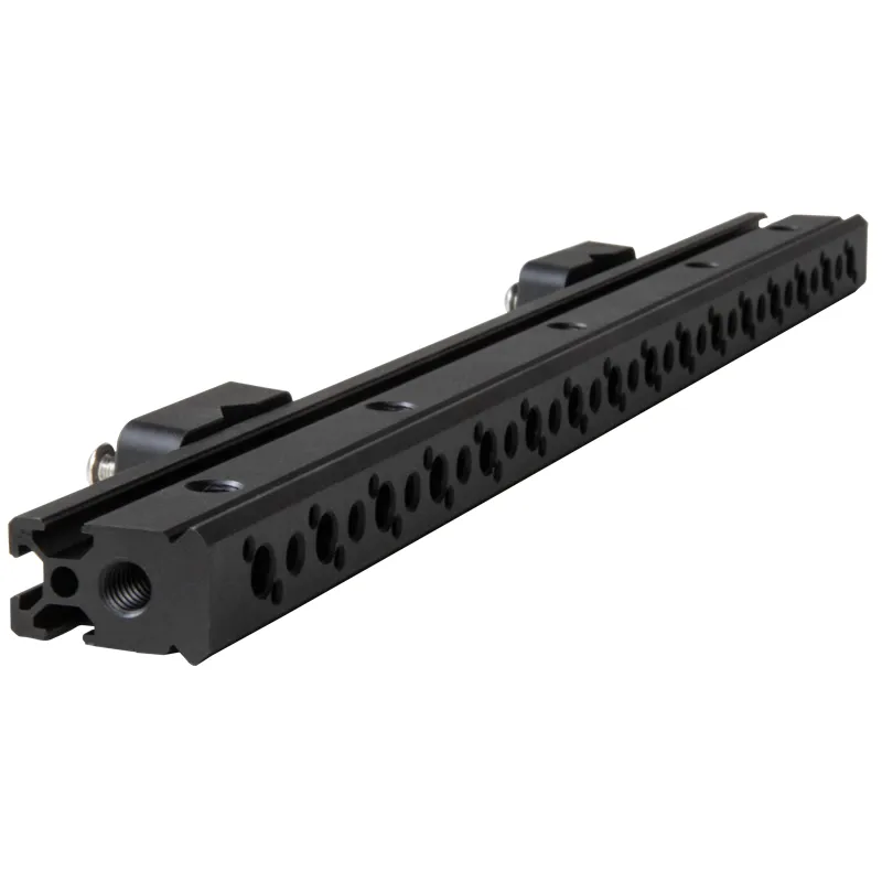Kupo Headrest Mounting Bracket is constructed from a black anodized aluminum extrusion bar. It features a total of 16 pieces of 3/8-16 anti-twist threads and 5 pieces of 1/4-20 threads horizontally, along with another 5 pieces of 3/8-16 threads vertically. This design allows for the mounting of various accessories such as monitors, recorders, wireless devices, focus units, and clamps on a cars headrest.