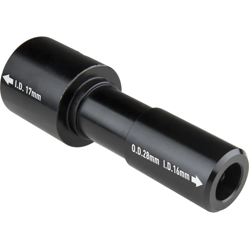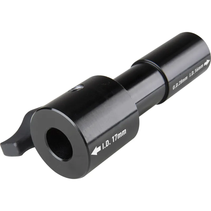 This is the most versatile adapter ever. The external diameter (28mm spigot) fits a junior receiver, while the internal diameters (16mm and 17mm at each end) suit a baby pin. Additionally, there is a threaded hole for relocating the set screws when they are not in use.