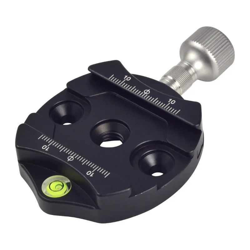 The Caruba Quick Release - DM-60 is suitable for mounting on tripod, monopod or ball head with 3/8" thread. Thanks to the sturdy dial, the DM-60 allows you to easily and quickly mount Arca-Swiss compatible tripod plates. The clamp is equipped with an integrated spirit level. The mounting plate is equipped with a recessed central socket on the top. The clamp has a diameter of 6 centimetres and a height of 1.7 centimetres.